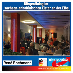 Auf Einladung von meinem Bundestagskollegen Volker Scheurell (MdL) nahm ich gemeinsam mit Arne Raue (MdL) am Bürgerdialog im sachsen-anhaltinischen Elster an der Elbe teil. Im sehr gut besuchten Saal der Gaststätte „Zum Anker“ stellten wir uns, nach kurzer Vorstellungsrunde, den Fragen der Gäste. Die Themen waren u. a. : Bürokratieirrsinn für Mittelstandsbetriebe, marode Infrastruktur, mögliche Gasmangellage und Bildung (insbesondere die Schulpflicht).