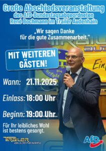 Der Eintritt ist frei. Auf Grund der begrenzten Sitzplätze wird jedoch um eine kurze Anmeldung unter tobias.heller@afdnordsachsen.de gebeten.